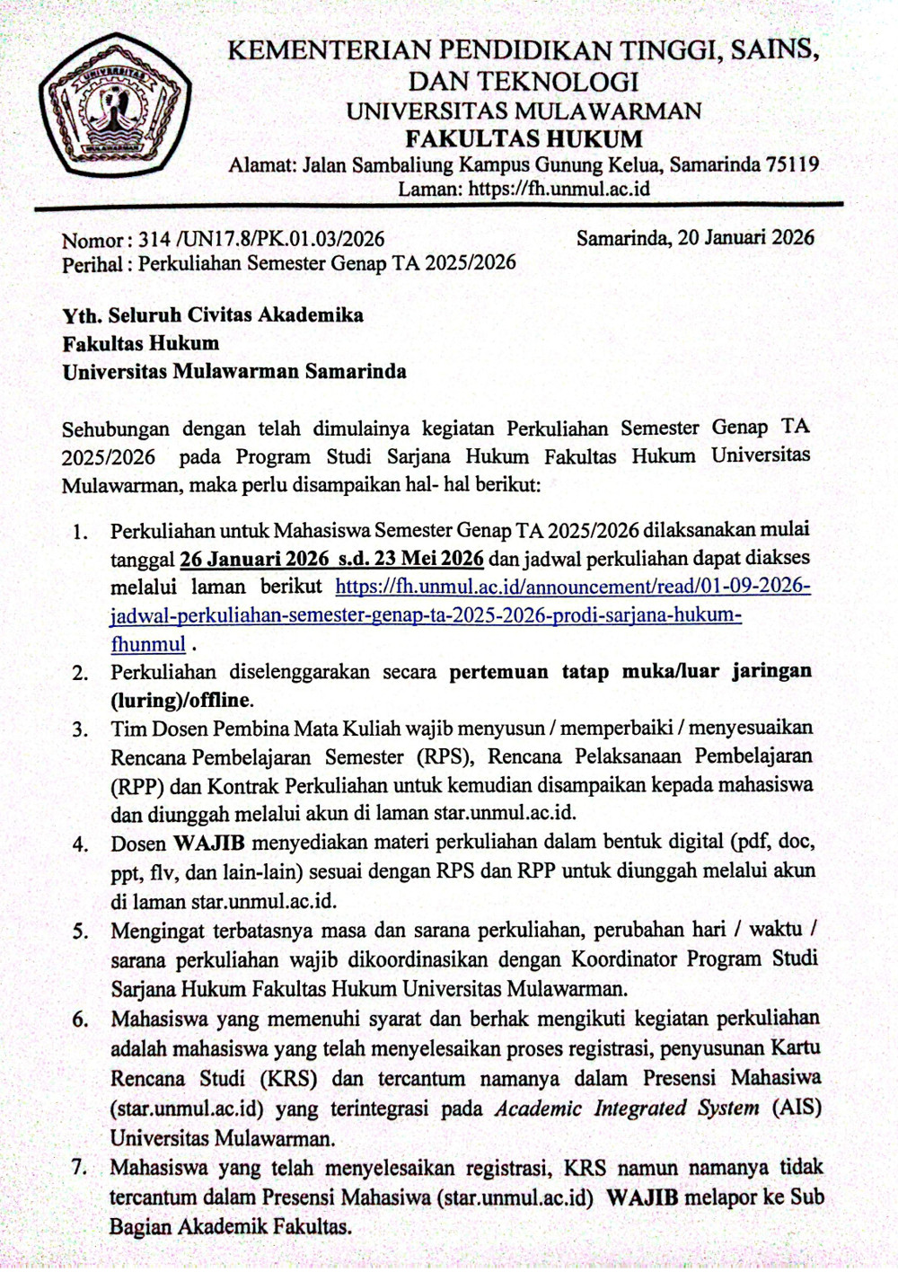 Sehubungan dengan telah dimulainya kegiatan Perkuliahan Semester Genap TA 2025/2026 pada Program Studi Sarjana Hukum Fakultas Hukum Universitas Mulawarman, maka perlu disampaikan Hal-hal sebagai berikut kepada seluruh Civitas Akademika Fakultas Hukum Universitas Mulawarman.