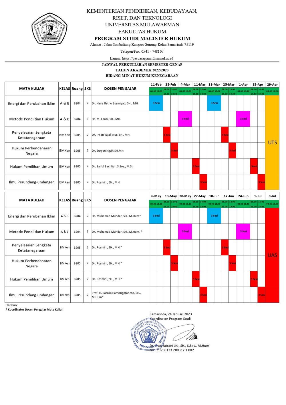 Berikut kami informasikan Jadwal Kuliah Program Studi Magister Ilmu Hukum Fakultas Hukum Universitas Mulawarman Semester Genap Tahun Akademik 2022/2023.