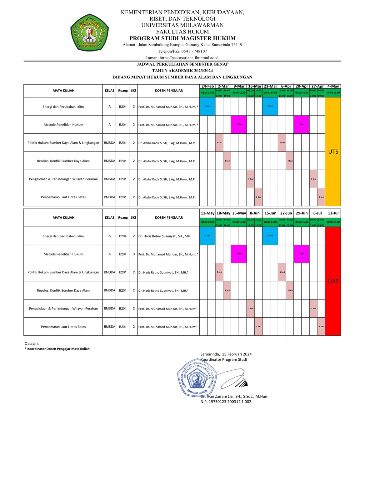 Foto 2: Jadwal Perkuliahan Prodi MH Semester Genap T.A. 2023/2024 Bidang Minat Hukum Sumber Daya Alam dan Lingkungan