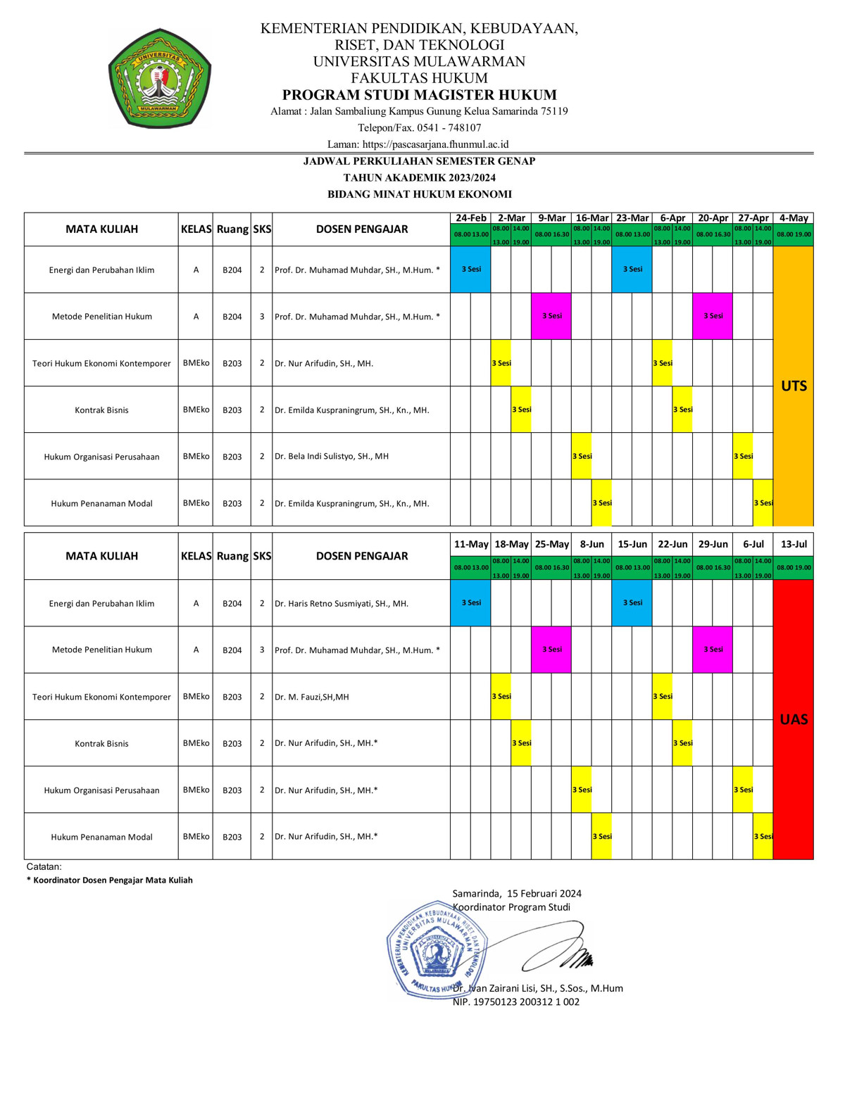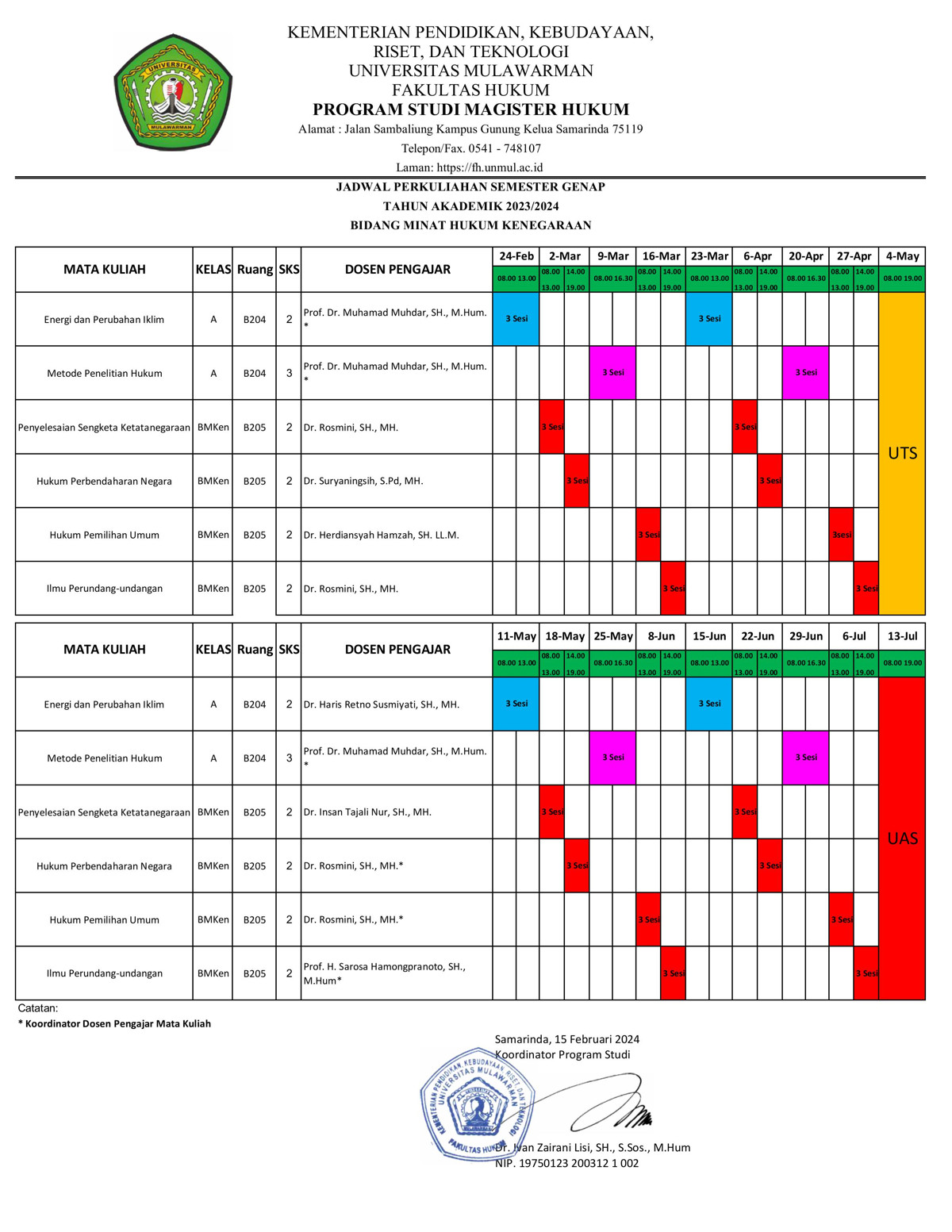 Berikut kami informasikan Jadwal Kuliah Program Studi Magister Hukum Fakultas Hukum Universitas Mulawarman Semester Genap Tahun Akademik 2023/2024.