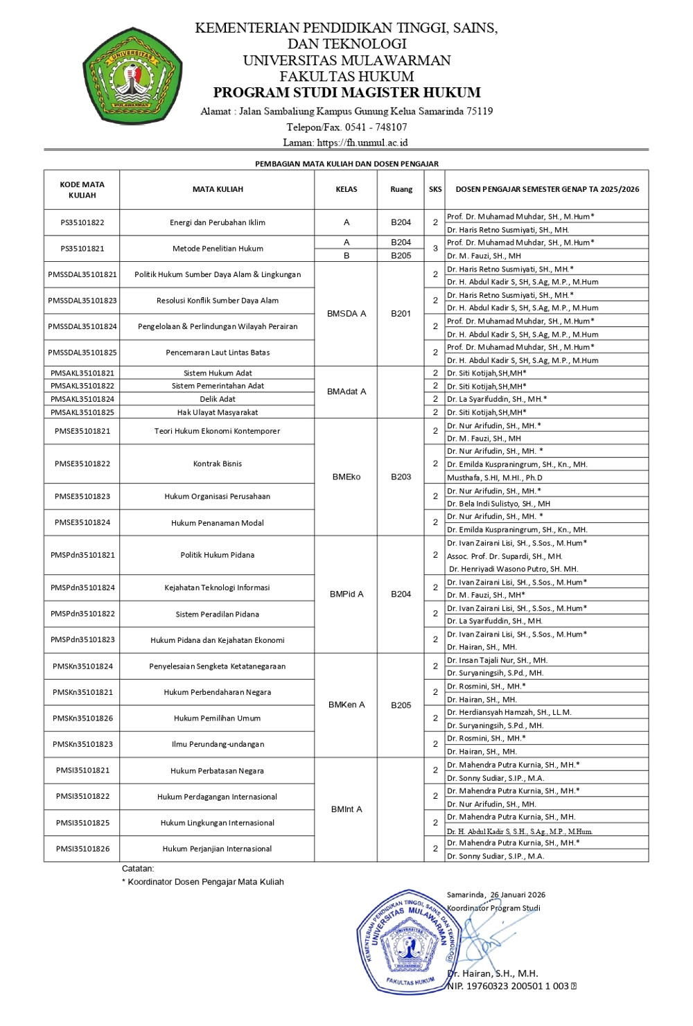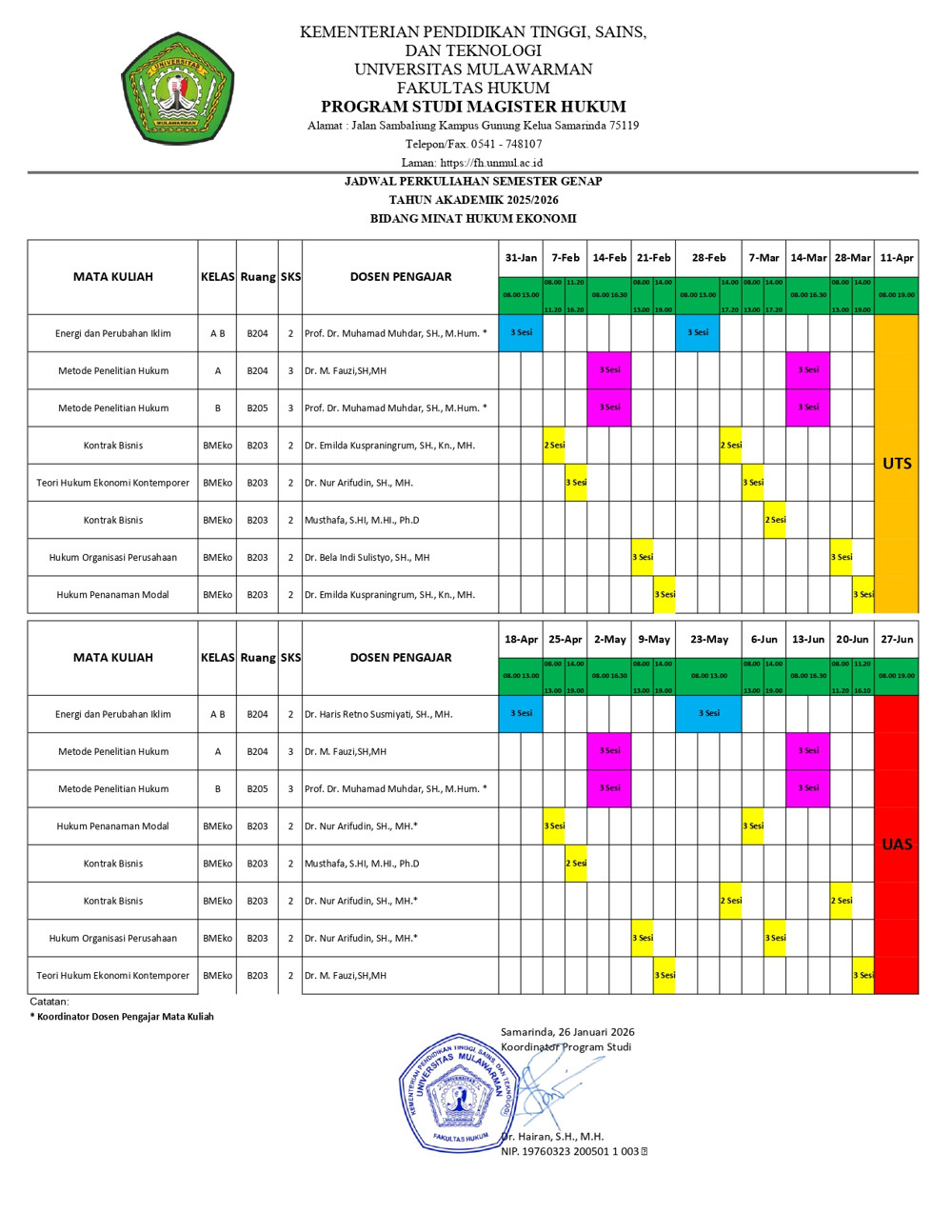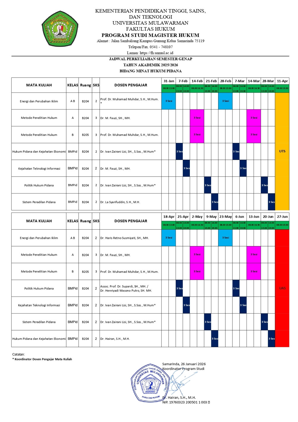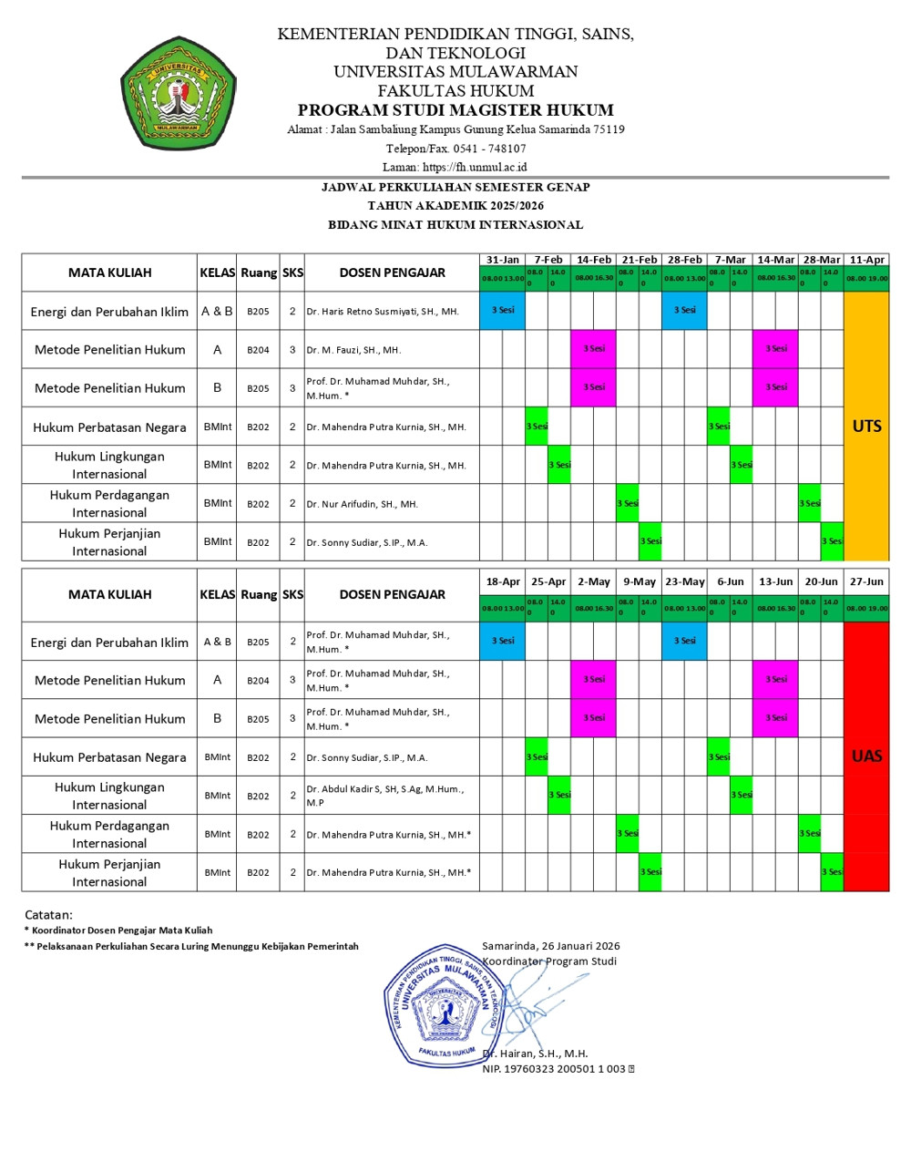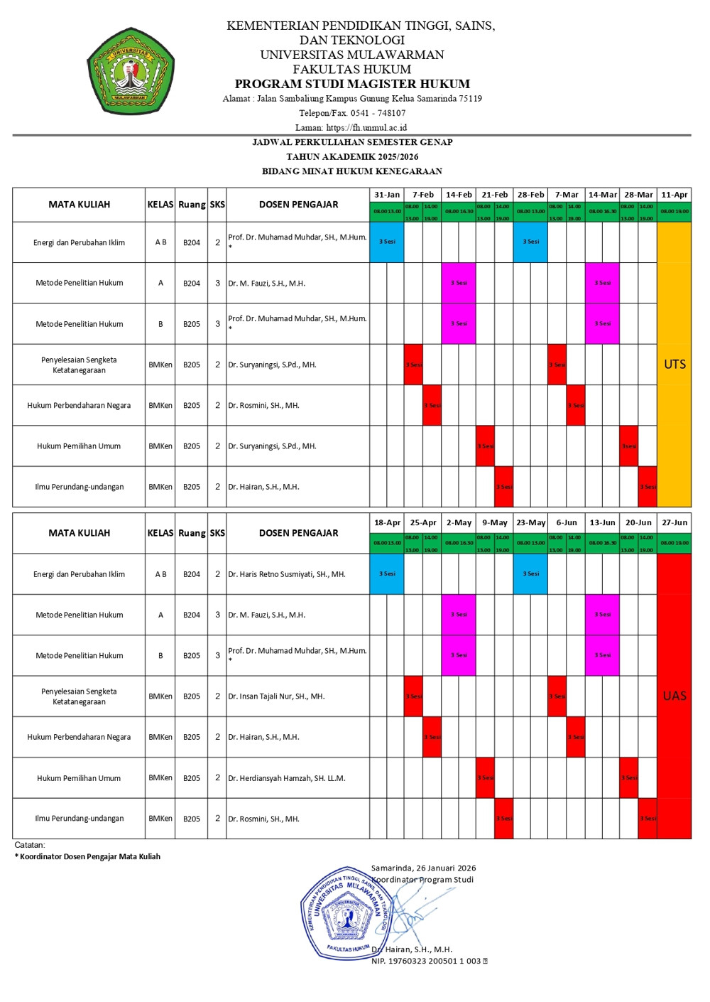 Berikut kami informasikan Jadwal Kuliah Program Studi Magister Hukum Fakultas Hukum Universitas Mulawarman Semester Genap Tahun Akademik 2025/2026.