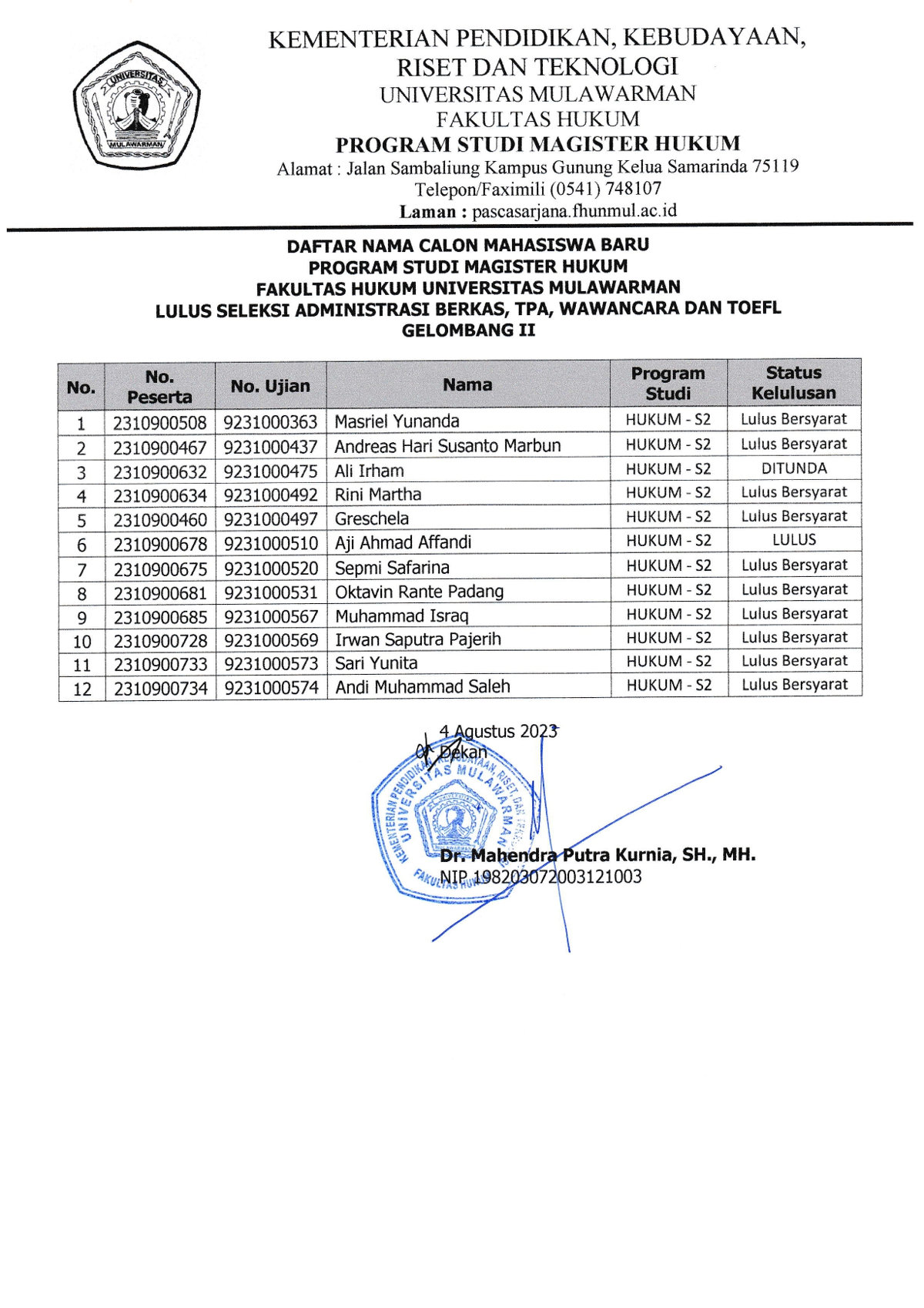 Sehubungan dengan berakhirnya seleksi berkas, tes potensi akademik, wawancara dan TOEFL penerimaan Mahasiswa Baru Tahun Akademik 2023/2024 pada Program Studi Magister Hukum Fakultas Hukum Universitas Mulawarman Gelombang 2, maka dengan ini kami sampaikan daftar nama calon Mahasiswa yang lulus seleksi Tahun Akademik 2023/2024 Gelombang 2.