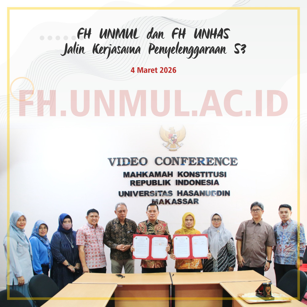 Fakultas Hukum Universitas Mulawarman (FH Unmul) dan Fakultas Hukum Universitas Hasanuddin (FH Unhas) menjalin kerjasama penyelenggaraan Program Doktor Ilmu Hukum (S3). Hal ini dituangkan dalam Perjanjian Kerja Sama (PKS) antara FH Unmul dan FH Unhas, yang ditandatangani oleh kedua pihak pada hari Rabu tanggal 4 Maret 2026, bertempat di Ruang Video Conference Mahkamah Konstitusi Republik Indonesia FH Unhas.