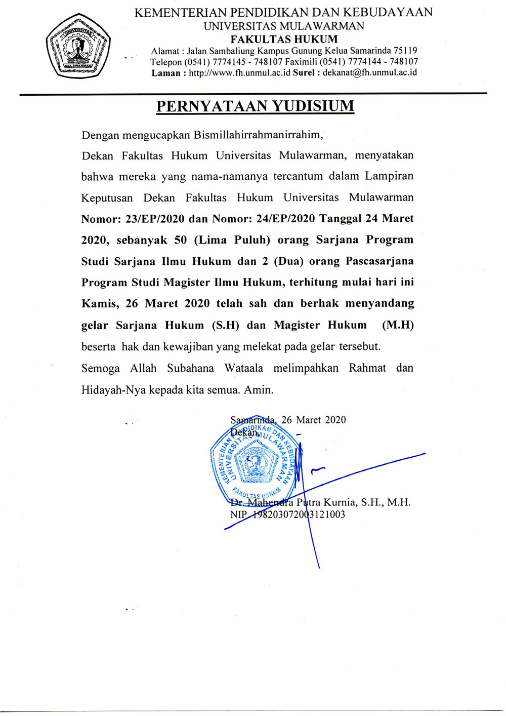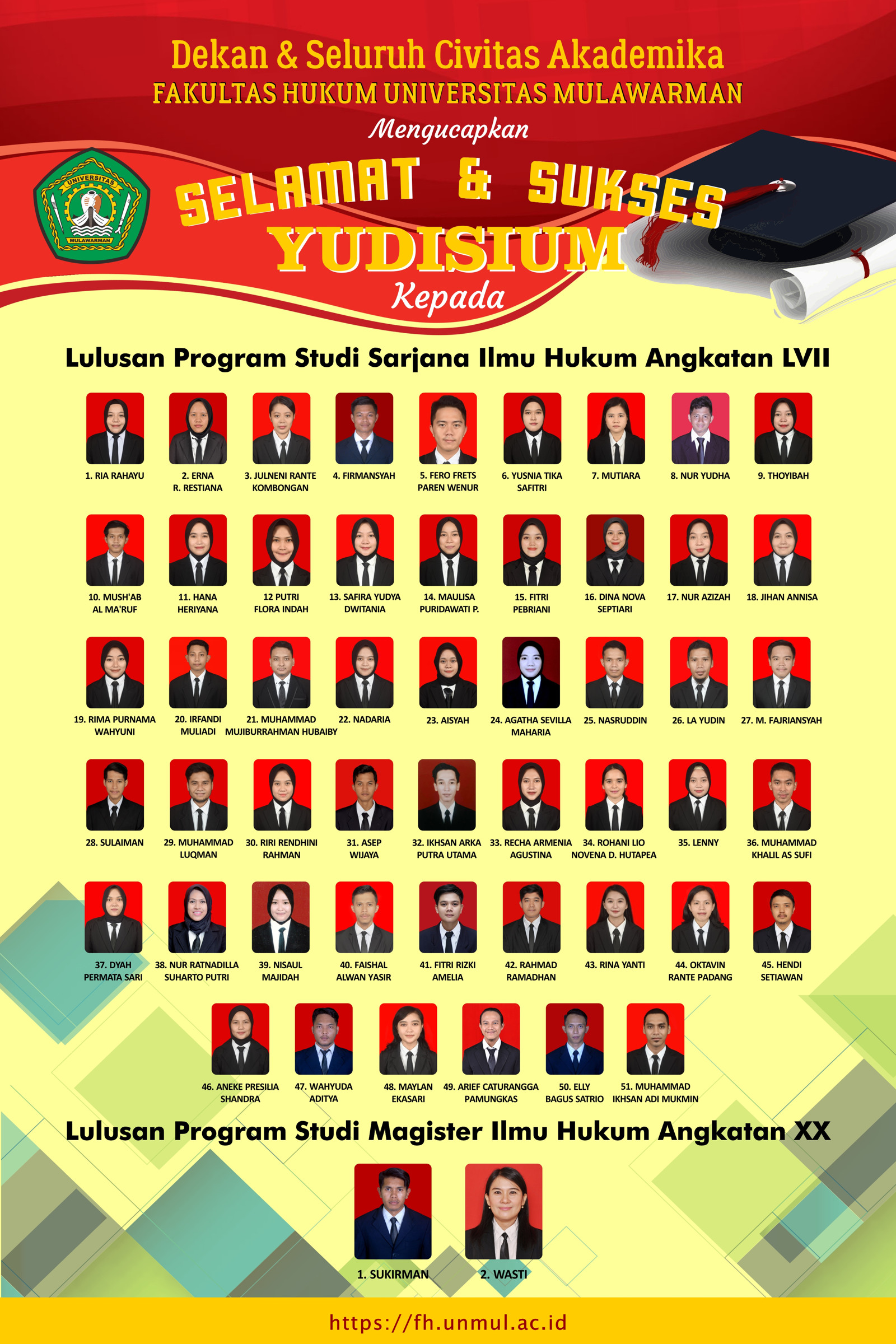 Seluruh Keluarga Besar Fakultas Hukum Universitas Mulawarman mengucapkan Selamat & Sukses Yudisium Lulusan Program Studi Sarjana Ilmu Hukum Angkatan LVII (57) dan Lulusan Program Studi Magister Ilmu Hukum Angkatan XX (20).