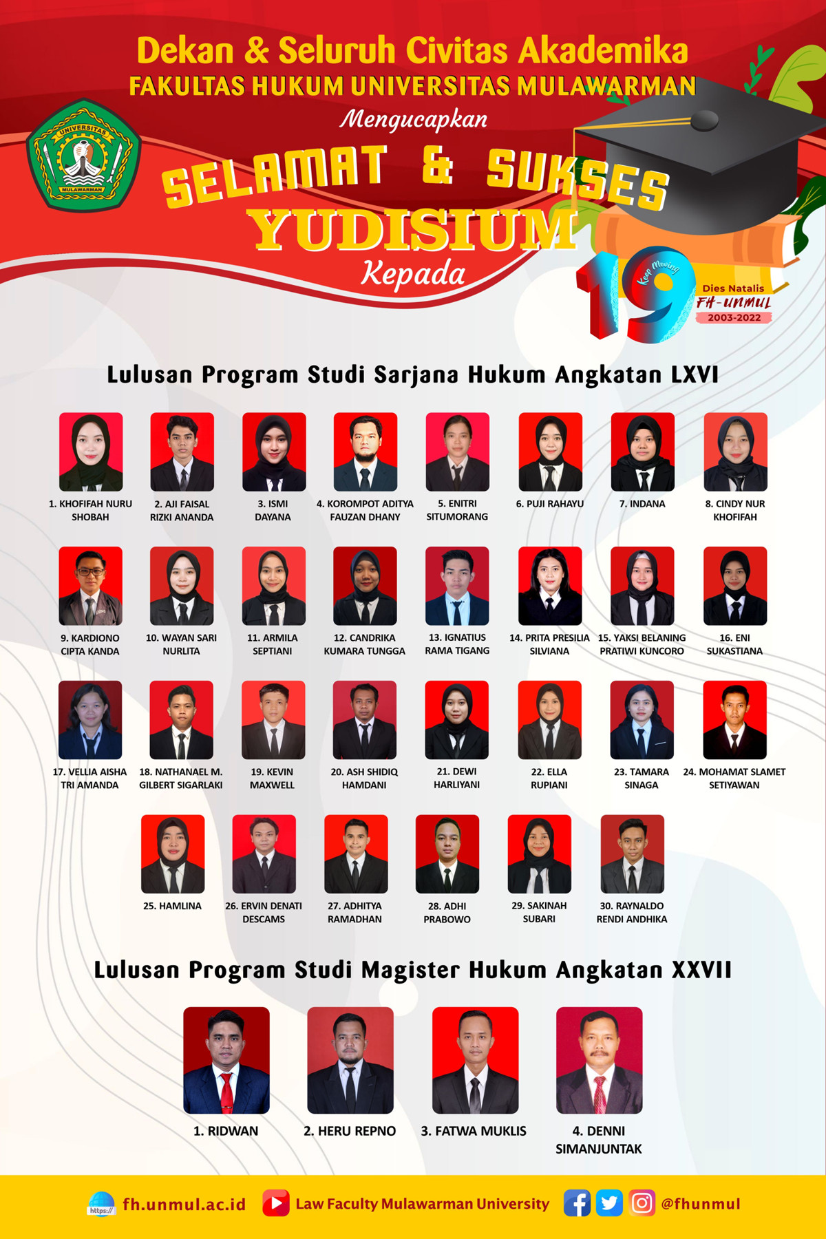 Seluruh Keluarga Besar Fakultas Hukum Universitas Mulawarman mengucapkan Selamat & Sukses Yudisium Lulusan Program Studi Sarjana Hukum Angkatan LXVI (66) dan Program Studi Magister Hukum Angkatan XXVII (27) Fakultas Hukum Universitas Mulawarman.