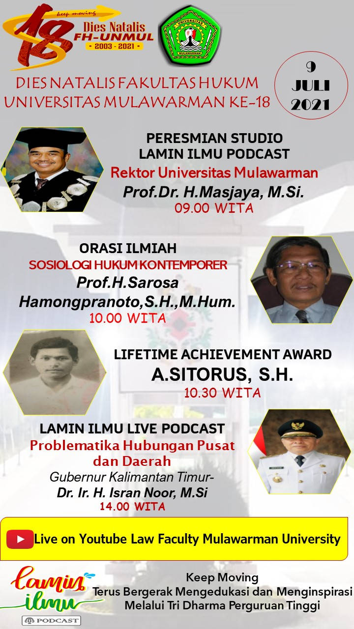 Dies Natalis Fakultas Hukum Universitas Mulawarman Ke-18 "Keep Moving - Terus Bergerak Mengedukasi dan Menginspirasi Melalui Tri Dharma Perguruan Tinggi" 9 Juli 2003 - 9 Juli 2021