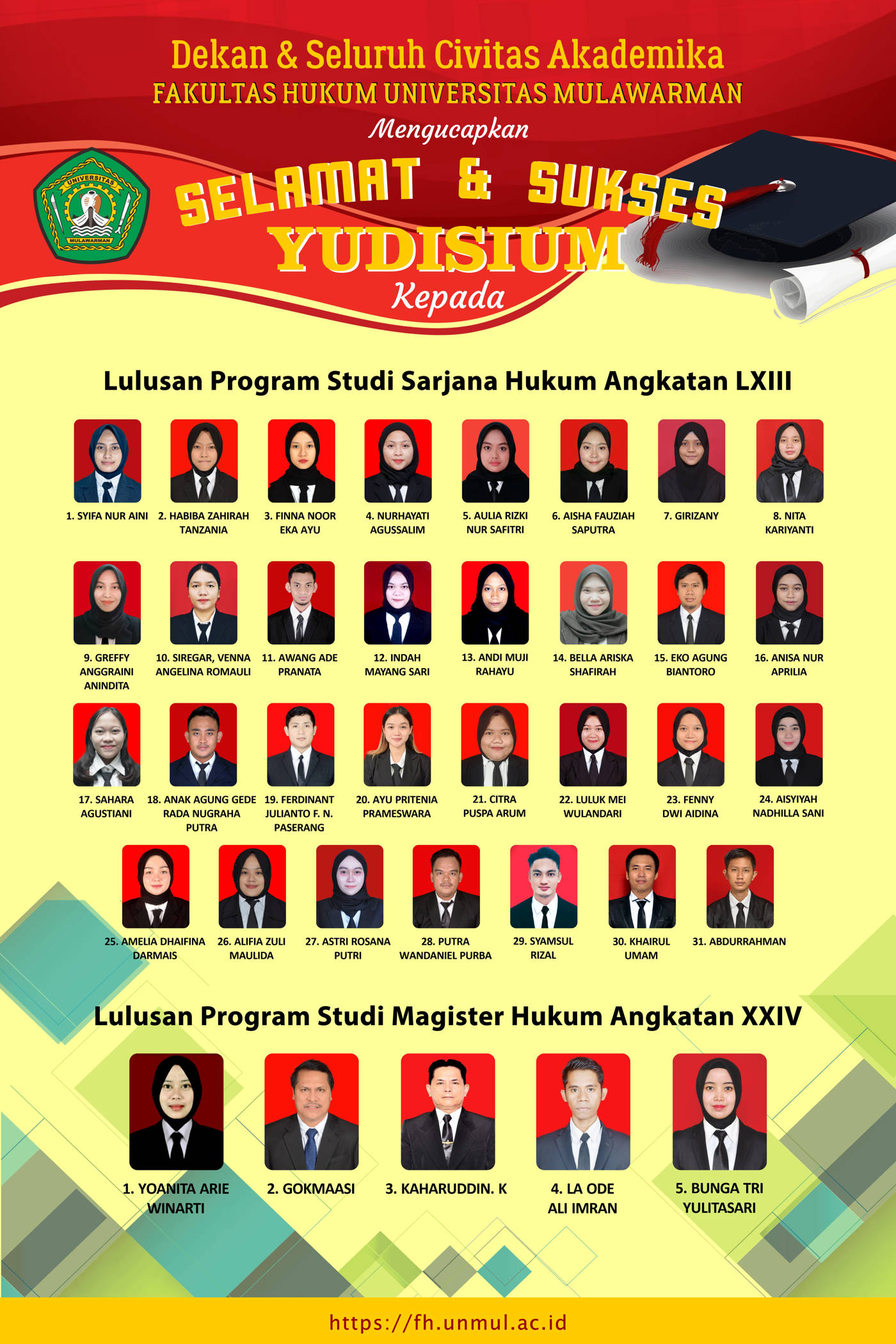 Seluruh Keluarga Besar Fakultas Hukum Universitas Mulawarman mengucapkan Selamat & Sukses Yudisium Lulusan Program Studi Sarjana Hukum Angkatan LXIII (63) dan Program Studi Magister Hukum Angkatan XXIV (24) Fakultas Hukum Universitas Mulawarman.