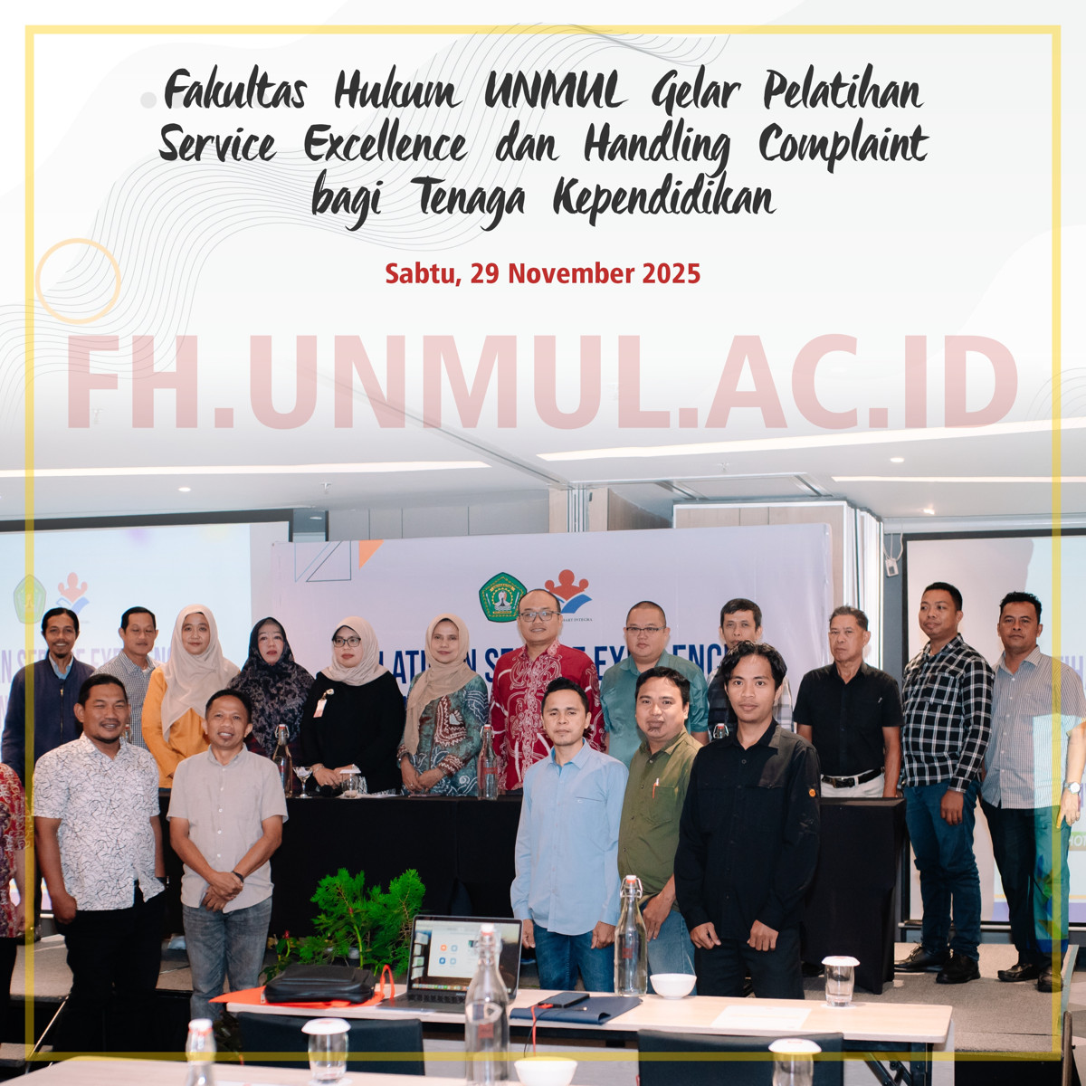 Fakultas Hukum Universitas Mulawarman (FH Unmul) menyelenggarakan kegiatan Service Excellence dan Handling Complaint pada Sabtu, 29 November 2025, bertempat di Hotel Ibis Samarinda. Kegiatan ini dilaksanakan dalam dua sesi dan diikuti oleh seluruh Tenaga Kependidikan Fakultas Hukum Universitas Mulawarman sebagai upaya peningkatan kualitas pelayanan publik di lingkungan fakultas.