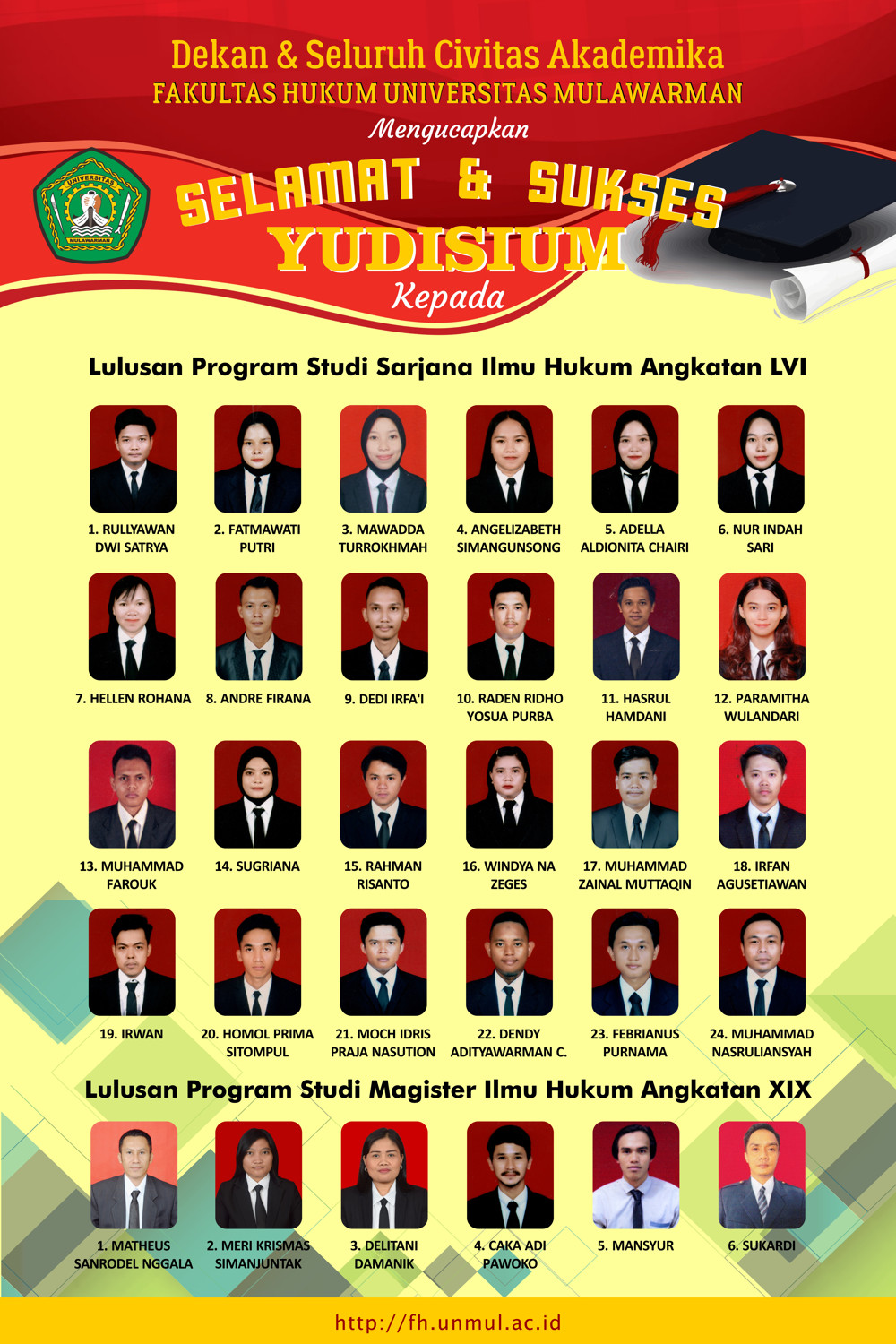 Seluruh Keluarga Besar Fakultas Hukum Universitas Mulawarman mengucapkan Selamat & Sukses Yudisium Lulusan Program Studi Sarjana Ilmu Hukum Angkatan LVI (56) dan Lulusan Program Studi Magister Ilmu Hukum Angkatan XIX (19).